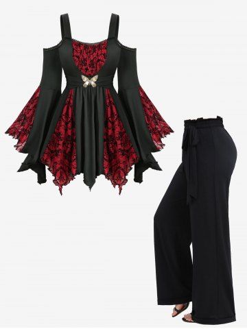 Alternative & Gothic Outfits > Gothic Flocking Mesh Lace Trim Cold Shoulder Flare Sleeves Top and Waist Ruffles Wide Leg Pants Plus Size Outfit