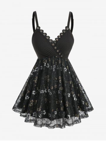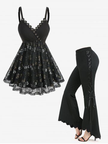 Alternative & Gothic Outfits > Floral Lace Sequins Overlay Surplice Top and Lace-up Scalloped Hem Solid Asymmetric Flare Pants Plus Size Outfit