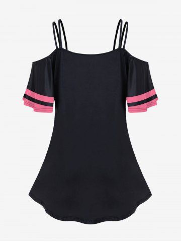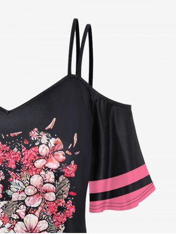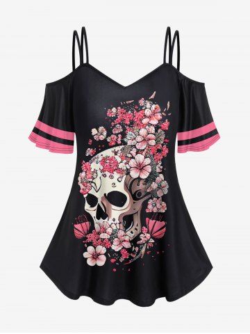 Gothic Floral Skull Print Open Shoulder Top and Floral Skull Print Leggings Outfit - Black