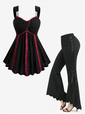Alternative & Gothic Outfits > Jacquard Pointelle Hollow Out Contrast Piping Top and Lace Up Side Scalloped Hem Flare Pants Plus Size Outfit