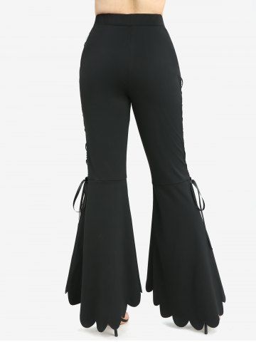 Jacquard Pointelle Hollow Out Contrast Piping Top and Lace Up Side Scalloped Hem Flare Pants Plus Size Outfit - Black
