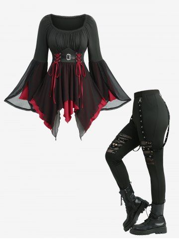Alternative & Gothic Outfits > Lace Trim Lace-up Tulip Hem Flare Sleeve Top and Skull Hollow Out Leggings Plus Size Outfit