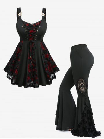 Gothic Lace-up Rose Lace Jacquard Tank Top and Skull Flocking Appliques Flare Pants Plus Size Outfit - Black