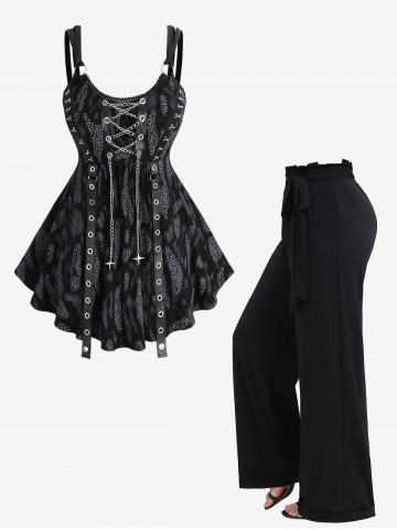 Gothic Leopard Print Lace Trim Chains Lace-up Tank Top and Ruffles Waist Wide Leg Pants Plus Size Outfit - Black