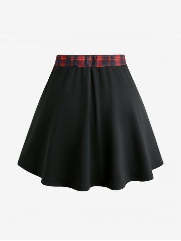 Gothic Rose Flocking Mesh Lace-up Tank Top and Patchwork PU Leather Stripes Plaid Skirt Plus Size Outfit - Black
