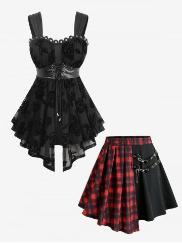 Alternative & Gothic Outfits > Gothic Rose Flocking Mesh Lace-up Tank Top and Patchwork PU Leather Stripes Plaid Skirt Plus Size Outfit
