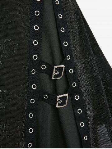 Plus Size Floral Mesh Flockinig Buckle Grommet Ribbed Pockets Flare Pants