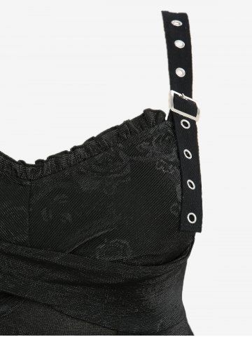 Plus Size Rose Flower Printed Crossover Bust Buckle Grommet Split Ribbed Layered Tank Top