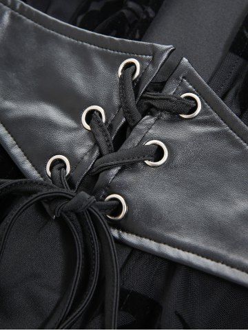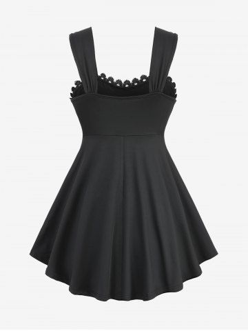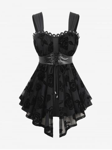 m*****d5Gothic Plus Size Rose Flowers Flocking Mesh Lace-up Grommets Lace Trim Asymmetrical Tank TopColor: BLACK Size: 2X | US 18-20Fits great and looks sexy! The lace and larger straps make it feel sexy and comfortable. Can be worn as a top or a mini dress.