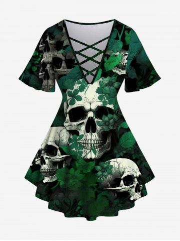 l*****05Gothic Skull Leaves Print Crisscross V Neck Short Sleeve T-ShirtColor: GREEN Size: 1X | US 14-16Comfortable and breathable soft material while getting to feel abit gussied up and sassy.