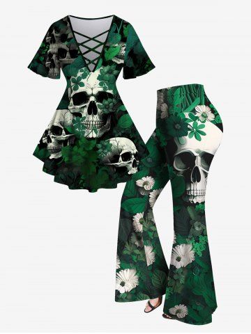 e*****e4Skull Leaves Print Crisscross V Neck Short Sleeve T-Shirt And Skull Flower Leaves Print Flare Pants Gothic OutfitColor: GREENThe shirt is a little big in the shoulder, but I do have narrow shoulders. Everything else fit great. loved the wide band elastic in the pants.
