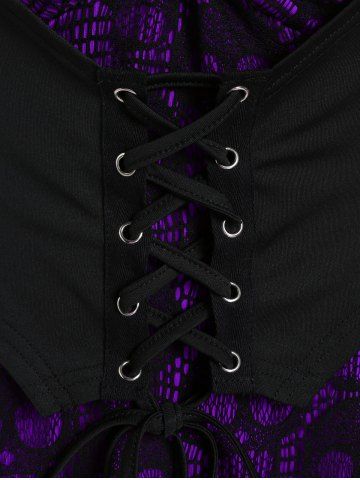 Plus Size Skulls Mesh Panel Bell Sleeves Twist Lace Up Asymmetrical 2 In 1 Top - Purple - M | Us 10