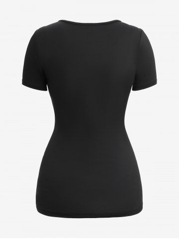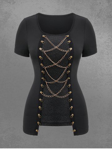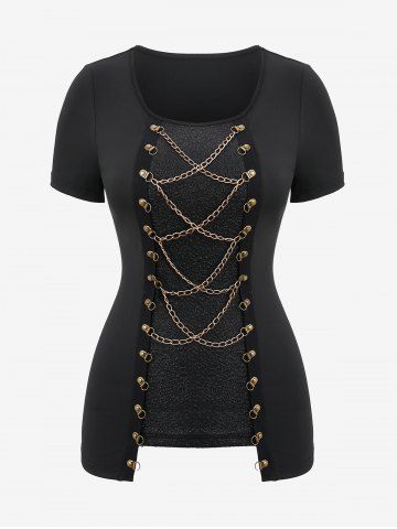 Gothic Chain Lace Up Hook and Eye Cracked Textured Patchwork Asymmetric T-shirt - Black - Xl