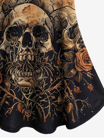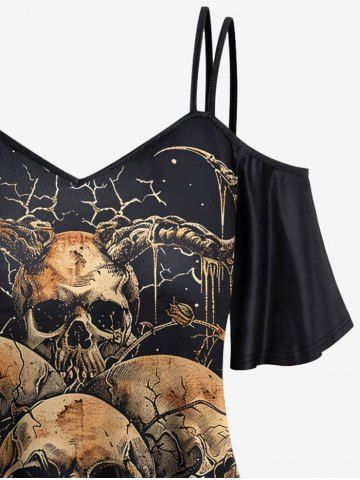 Gothic Cold Shoulder Distressed Skulls Rose Flower Horn Print Cami T-shirt - Black - 2x