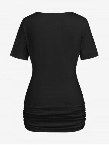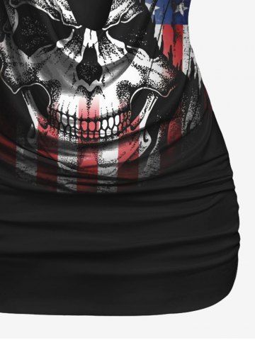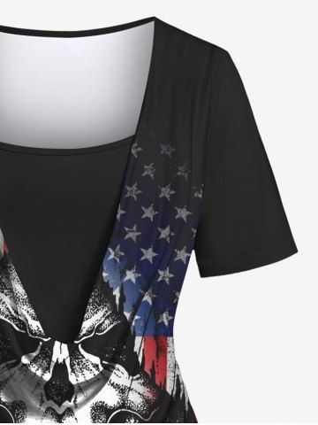 Gothic Cowl Neck Distressed Skull Patriotic American Flag Print Ruched 2 in 1 T-shirt - Black - M