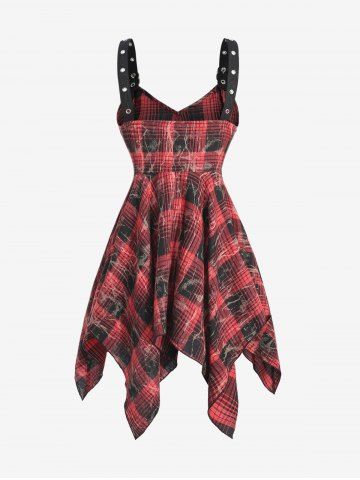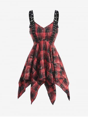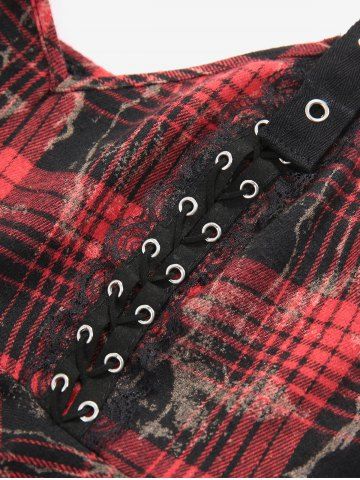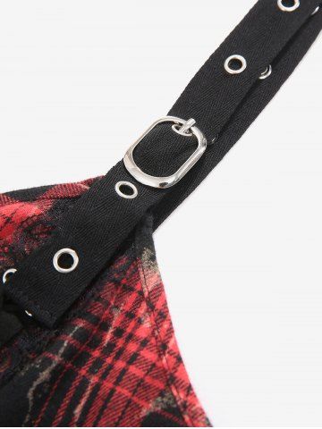 Gothic Distressed Plaid Lace Up Buckle Grommet Backless Asymmetric Handkerchief Tank Top - Red - L
