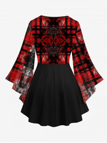 Gothic Grunge Ruined Plaid Print Flare Sleeves Lattice Long Sleeves T-shirt - Red - 3x