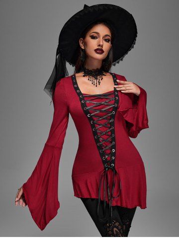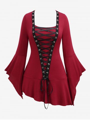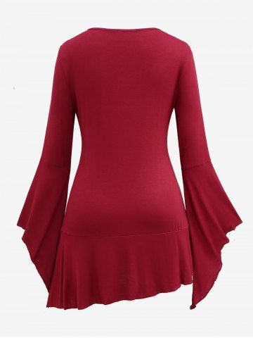 Gothic Lace Up Ruffles Ruched Flare Sleeves Asymmetric T-shirt - Red - L | Us 12