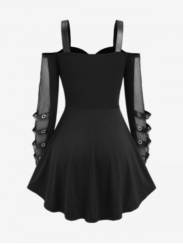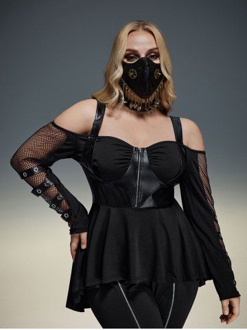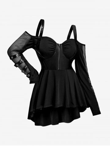 Gothic PU Panel Ruched Zipper Fishnet Off The Shoulder High Low T-shirt - Black - 2x | Us 18-20