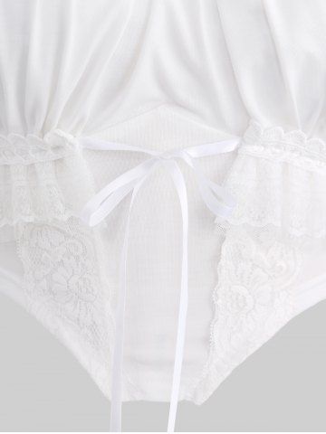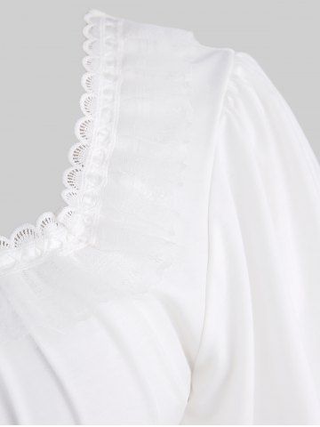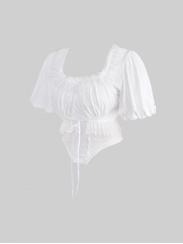 Gothic Puff Sleeves Floral Lace Panel Tied Ruffles Ruched Solid Asymmetric Cropped Top - White - 1x | Us 14-16