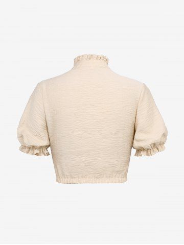 Gothic Puff Sleeves Ruffles Neck Full Buttons Solid Textured Cropped Top - Light Coffee - 2x | Us 18-20