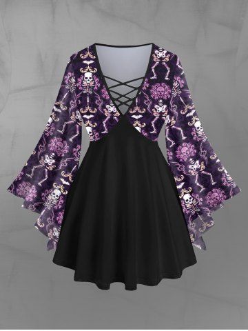 Alternative & Gothic Tops > Gothic Skulls Skeleton Vintage Floral Graphic Print Lattice Patchwork Flare Sleeves Blouse