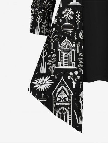 Gothic Skulls Tree Flower House Print Patchwork Asymmetric 2 in1 Long Sleeves Top - Black - Xs