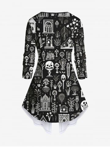 Gothic Skulls Tree Flower House Print Patchwork Asymmetric 2 in1 Long Sleeves Top - Black - 5x