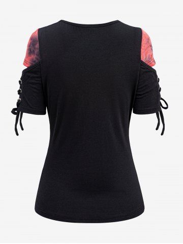 Gothic Tie Dye Lace Up Ripped 2 in 1 Short Sleeves T-shirt - Red - Xl