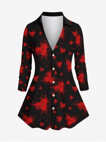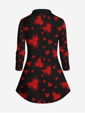 Gothic Turn-down Collar Full Buttons Heart Painting Splatter Watercolor Print Long Sleeves Valentines Shirt - Black - 3x