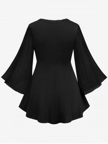 Plus Size Ink Painting Mesh Flare Sleeves Lace Up Ruched T-shirt - Black - 4x | Us 26-28