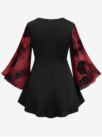 Plus Size Ink Painting Mesh Flare Sleeves Lace Up Ruched T-shirt - Deep Red - 2x | Us 18-20