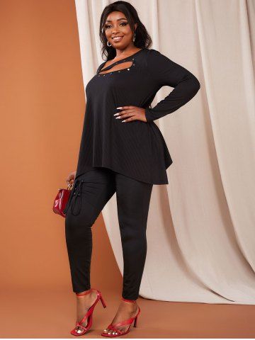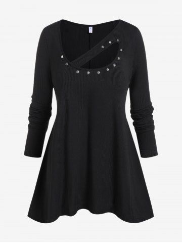 h*****y4Plus Size Ribbed Cutout Rivet Uneven Hem Tunic TeeColor: BLACK Size: 5XThis top is very comfortable if just a little too short. It is is a breathable fabric, fits well, and I love the cutout asymmetrical detail in front.
