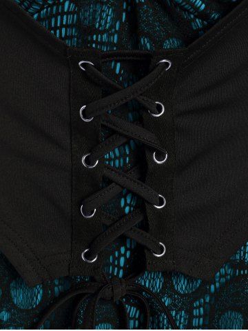 Plus Size Skulls Mesh Panel Bell Sleeves Twist Lace Up Asymmetrical 2 In 1 Top - Sky Blue - M | Us 10