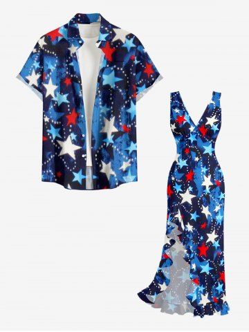 Patriotic American Flag Print Ruffles Split Dress - Deep Blue - Xxxl