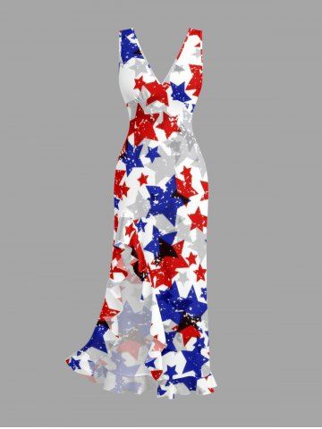 Patriotic American Flag Stars Print Ruffles Split Surplice Dress - White - L
