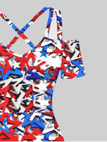 Plus Size Cold Shoulder Colorful Stars Patriotic American Flag Print Crisscross A Line Dress - Multi-a - 3x