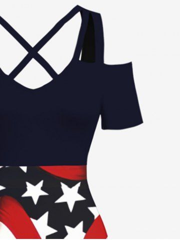 Plus Size Cold Shoulder Striped Ribbon Patriotic American Flag Print Crisscross A Line Dress - Black - 2x