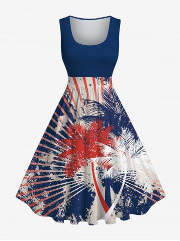 American Flag Dresses > Plus Size Distressed Coconut Tree Patriotic American Flag Light Beam Tie Dye Print 1950s Vintage Swing A Line Dress