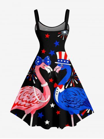 Plus Size Flamingo Patriotic American Flag Print Hawaii A Line Dress - Black - S