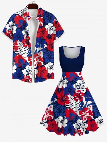 American Flag Dresses > Plus Size Hibiscus Flower Palm Tree Leaf Print Hawaii 1950s Vintage Dress