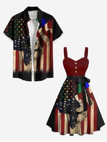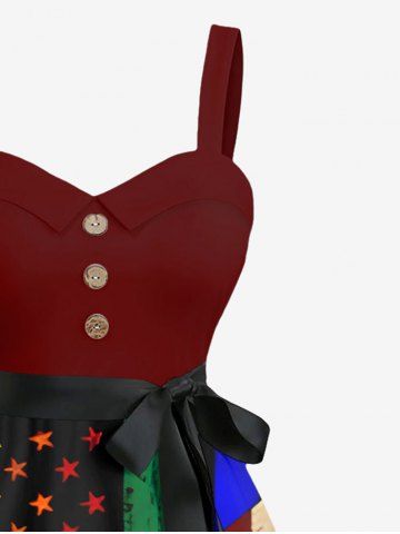 Plus Size Ink Painting Patriotic American Flag Print Button A Line Tank Dress with Removable Belt - Deep Red - 2x