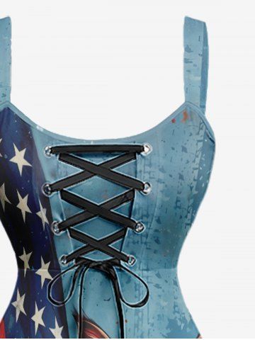 Plus Size Patriotic American Flag Cat Print Lace Up A Line Dress - Light Blue - S