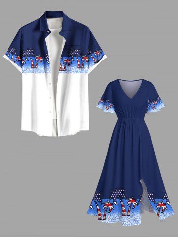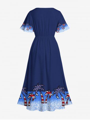 Plus Size Patriotic American Flag Coconut Tree Contrast Colorblock Print Hawaii Split Pocket A Line Midi Dress - Deep Blue - L