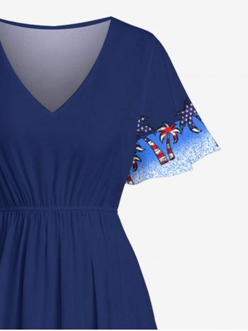 Plus Size Patriotic American Flag Coconut Tree Contrast Colorblock Print Hawaii Split Pocket A Line Midi Dress - Deep Blue - 3x