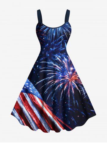 Plus Size Patriotic American Flag Fireworks Galaxy Print A Line Tank Dress - Deep Blue - 5x