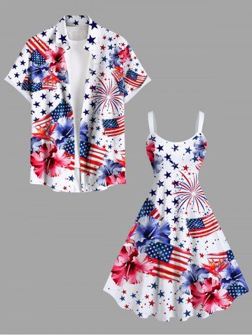 Plus Size Patriotic American Flag Fireworks Hibiscus Floral Print Hawaii A Line Tank Dress - White - S