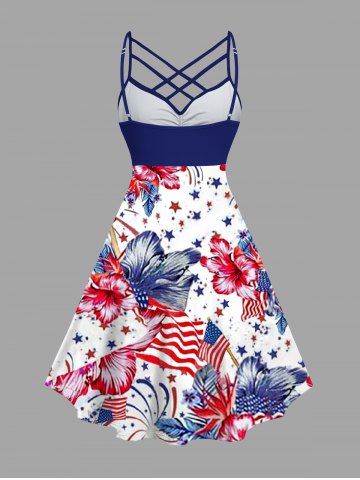 Plus Size Patriotic American Flag Fireworks Hibiscus Flower Print Ruched Lattice Crisscross Straps Dress - Blue - 6x