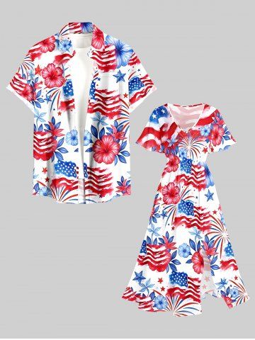 American Flag Dresses > Plus Size Patriotic American Flag Fireworks Hibiscus Flowers Print Split Midi Dress