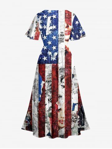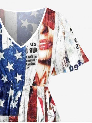 Plus Size Patriotic American Flag Newspaper Print Split Pocket A Line Midi Dress - Blue - 3x